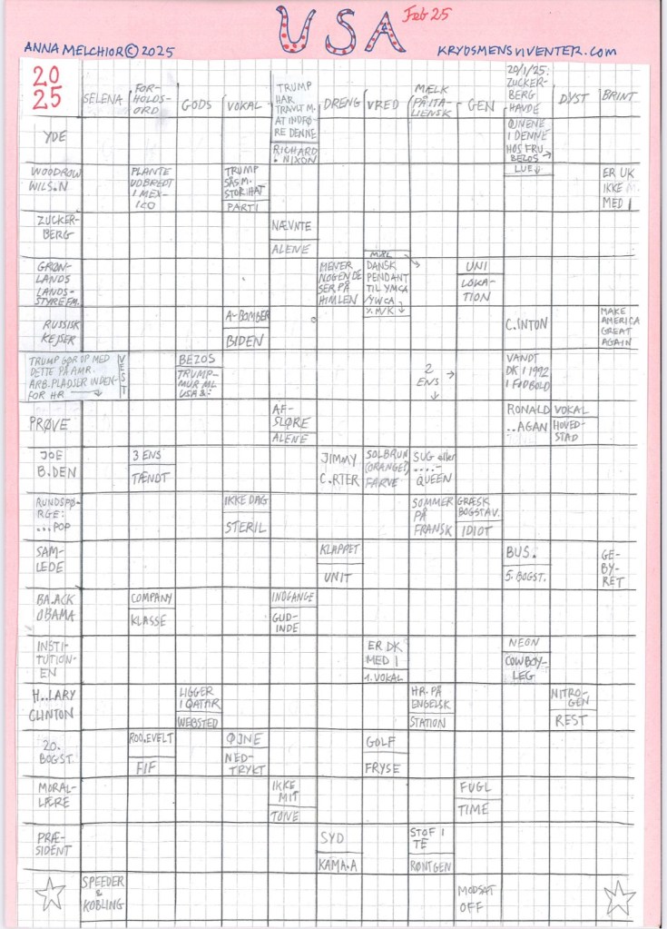 USA fylder altid. For tiden på nye måder. For at sige det pænt. Det er også pænt at kalde det en ny begyndelse i overskriften, men en ny slutning er så trist. Vi må håbe, som Obama plejede at sige. Denne krydsordsquiz har USA pr. februar 2025 som tema.