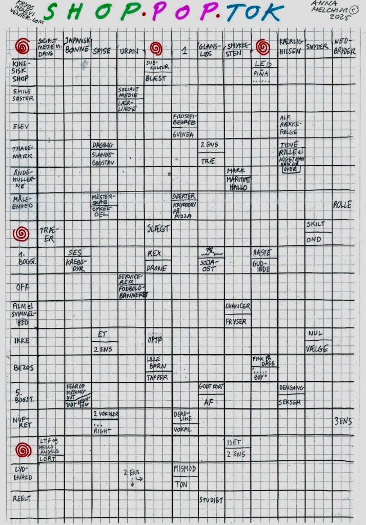 En letbenet krydsord med flere ord indenfor, hvad der kaldes overflade, overforbrug, overdrev – camoufleret under titlen Shop Pop Tok.